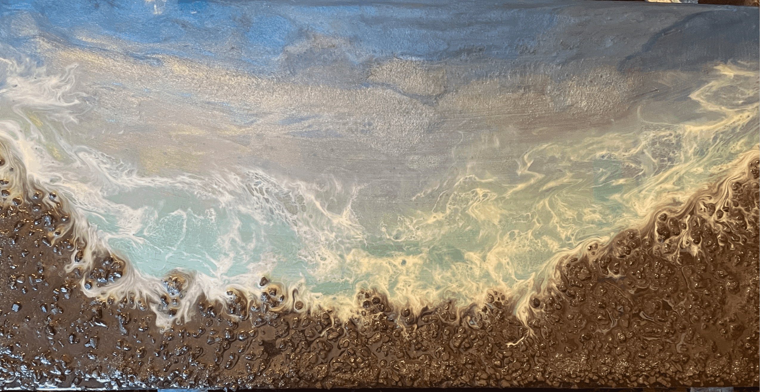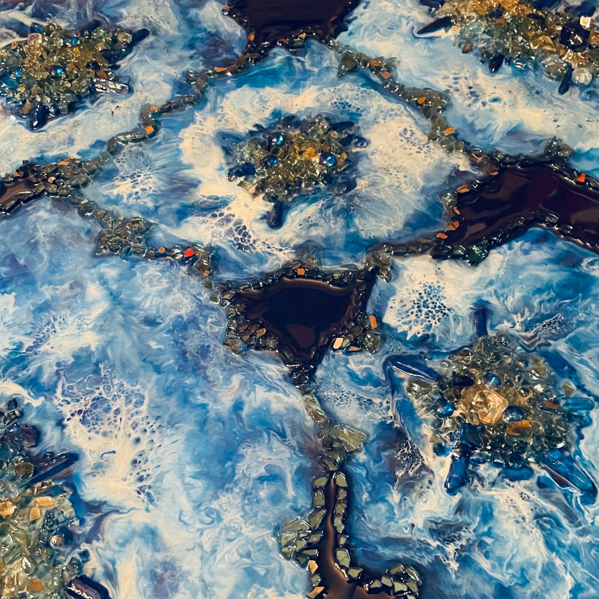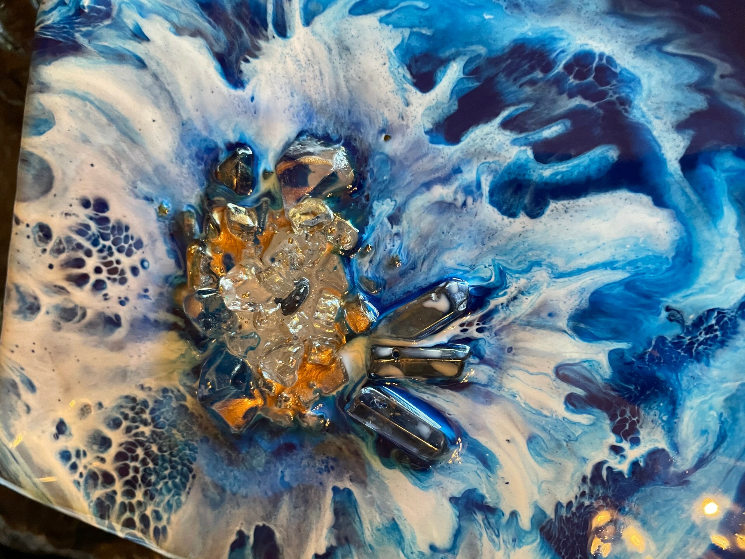 I am a multimedia artist I do resin jewelry, resin painting I do fluid art. I have custom orders where people will have me have specific colors that all you know that they like and then I’ll add in you know things that would match that to heighten it a little more than just you know if someone says oh I want gray and white You need to have more than just the gray and the white so you help kind of do little samples for them with colors that can go with the gray and the white but to give it more than just a couple colors and if they want a lot of cells because I do a lot of fluid Art, resin Art, I make resin jewelry. I do acrylic paintings. I do resin coasters, resin table tops, many beach, resin paintings turtle resin sculpture pieces. I love the beach so I have acrylic paintings of dolphins and underwater, and I used to scuba dive so I take my own experiences and add them to my art. I definitely put my heart into everything I do With my art. I am most proud of finding a way to make something that is a one of a kind and my art keeps growing and evolving in so many ways. I love so many aspects of anything art but when I am still growing, adding in a twist into each piece. Sometimes I can make a piece and it only took an hour and then there are pieces that can take a couple weeks and a hundred hours in. It just depends on what I’m making. I really listen to my customers and I want them to love their piece as much as me if not more. What sets me apart I think is I am a multi-media artist that I have 6 generations of family doing art so I was always exposed to art and that’s how I do a twist and mixed media cause so much exposure to beautiful different art throughout my life.