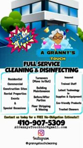 My story is probably like some others as in when you have a vision; you act on it. I’ve also dreamed of owning and building a business of my own. Particularly due to my daughter and wanting to provide her as best I can so that she may see the possibilities of making her own staple in life, owning your own, and being self-employed. After my tenure at Bowie State University, I started a few businesses but didn’t get that feeling of satisfaction. I had been working as a coordinator at Baltimore City Community College. In my position, I enjoyed helping students, but I knew I could also be helpful in another arena. I had a grandmother who cleaned for a living at that time, and people loved her work. She had longtime customers and took on new customers if and when she could. While working at BCCC, I would still help my grandmother on cleaning jobs. In helping her, I was learning useful tools that I never realized mattered so much with cleaning. But as my grandmother told me, if ”Brandon, if you want to do a good job, you have to be thorough.” My grandmother was known for being thorough and detailed in her cleaning, so detailed that often she would be really tired after a day of work. She would pull dressers, chairs, and tables out and clean behind them, cleaning baseboards, making beds, and carefully tucking and folding the sheets, which looked very impressive. At the end of the cleanings, people could tell she had been there as they complimented the fresh scents that surfaced the hall and stairways. She just had that “granny’s touch.” I thought to myself cleaning would be a great business as I was already use to the experience of cleaning in and around my home and my grandparents’ home. I also learned that there were people who either did not like to clean, did not have the time, or just preferred to hire professional cleaning services. As I’m working my 8-5 – 40 hours a week job (of which I was grateful for), I decided to begin working on starting my own cleaning business. This business could afford me the opportunity to not only help others with their cleaning needs but to allow me to decide my own hours of work and to eventually build a business that may outlive me and create a family establishment to live on through my daughter. I stopped working at BCCC and started my cleaning company (A Grannys Touch, LLC). Within six months, I accepted my first cleaning contract for Mayflower Apartments in Baltimore City. From there on A Grannys Touch, LLC has serviced several businesses repeatedly and offered numerous referrals (Huey Brand, Euphoria Night Club, Papi Cusine, Ouftur Brand, Waaah Clothing, Bella Bliss Spa, Towson Nights Hooka Lounge, Unitz by Jaz, Rite Aids, Value City, Daikeara Hair Salon, BJ Mallards Bar, and grill, Purple Peach Nail Bar, Soul Source Restaurant, PYT Training Studio, Fresh Kicks Sneaker Laundry, Munchies Food Truck, LOM Tags and Title, Paparazzi Spa, UREE Real Estate, Style 4 You Boutique, TV Biddys, Elevated Towing Services, The Beauty Room Salon, Salontra Suites, Sashae Selections, 2021 Hooka Lounge, Hood Fellas Brisro, and Catering to name a few. In addition, during the initial COVID-19 epidemic, I also serviced many establishments in creating a fresh, clean, and sanitized environment. A Granny’s Touch LLC lives on! “Who doesn’t want a Granny’s Touch.”