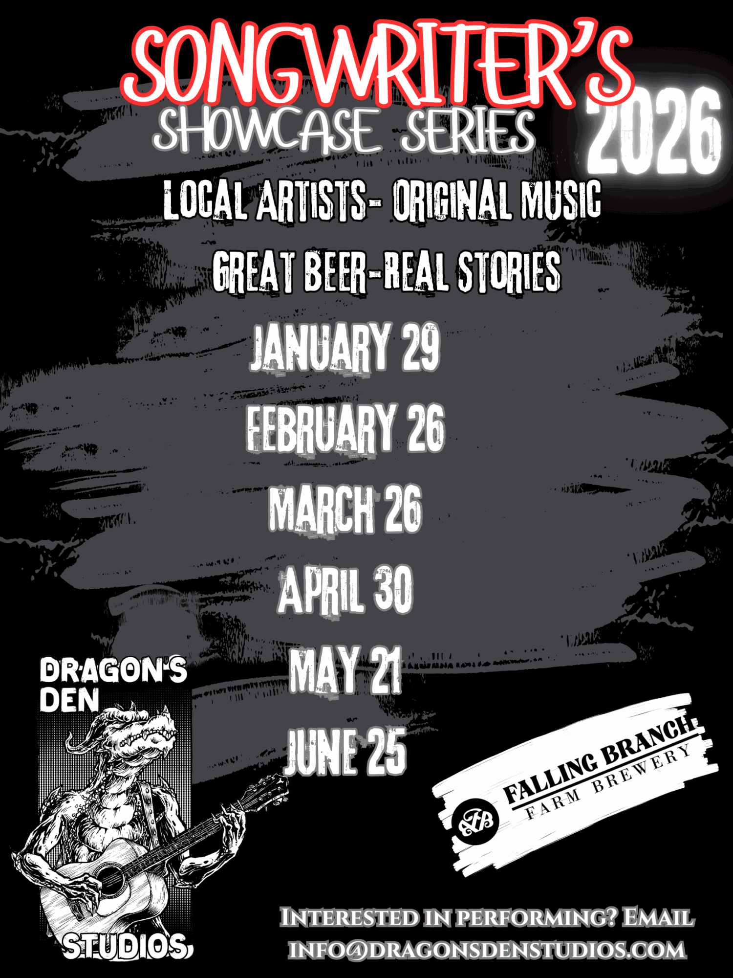 Hello! My name is Dave Ninos, I am the owner and lead producer of Dragon’s Den Studios, a music production business headquartered in Harford County, Maryland. We record and produce artists, usually those just starting out, as well as support the local music community through our monthly Songwriter Showcase, in partnership with Falling Branch Brewery. Every month we bring three artists to the brewery to share their original music and the stories behind those songs.