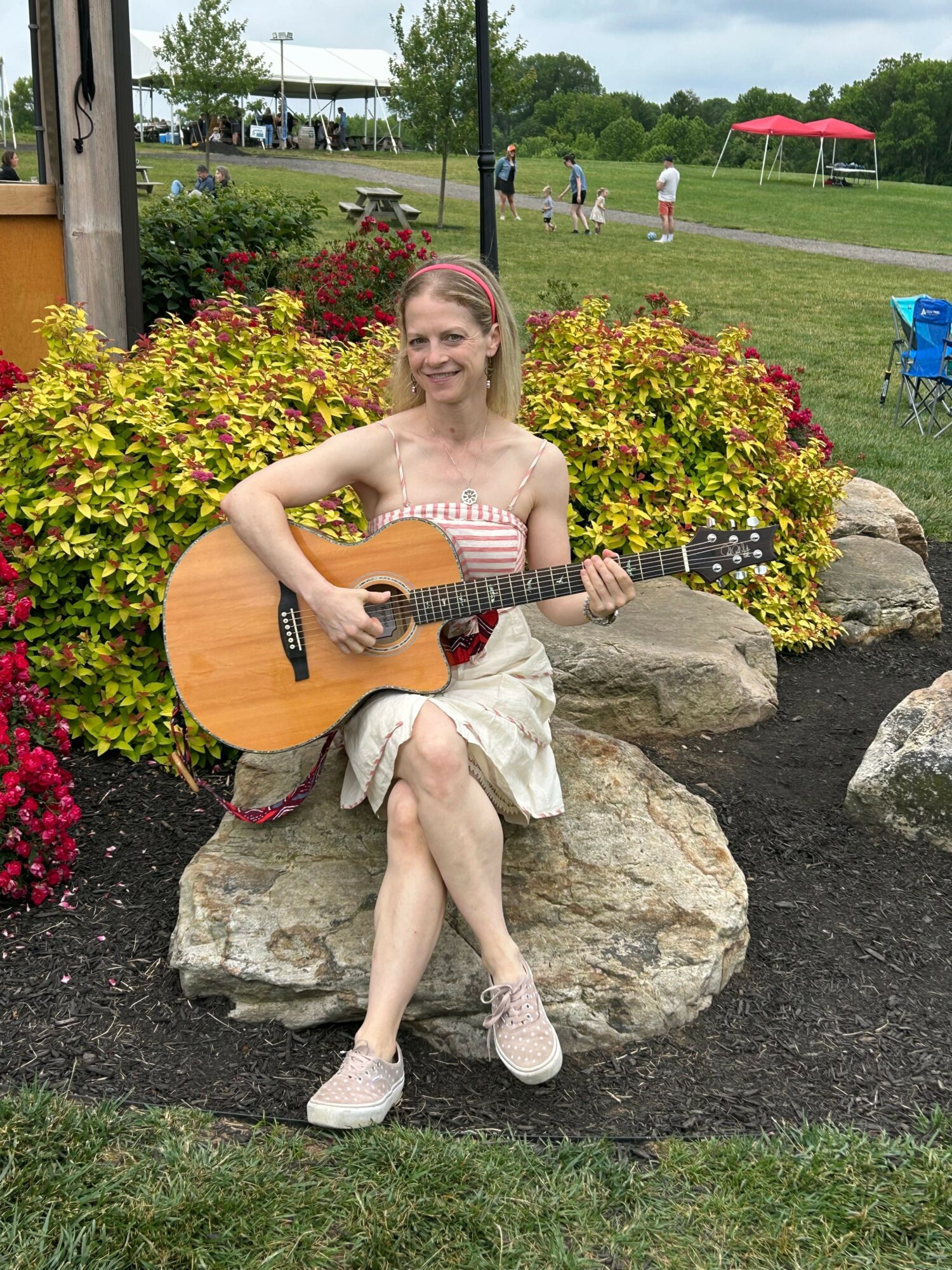 I literally shook with nerves for the first month or so, and would get up at 4 am every day to practice and re learn my songs before starting my workday. It felt both exhilarating and terrifying. I wondered if anyone would want to have me play a show again, or if I could even get my skills back up to par to play for hours like I used to. But, gradually, I started feeling confident again, and in October of 2023 had my first shows again after almost 14 years. I started playing with other musicians, and making connections and becoming a part of the local music scene.