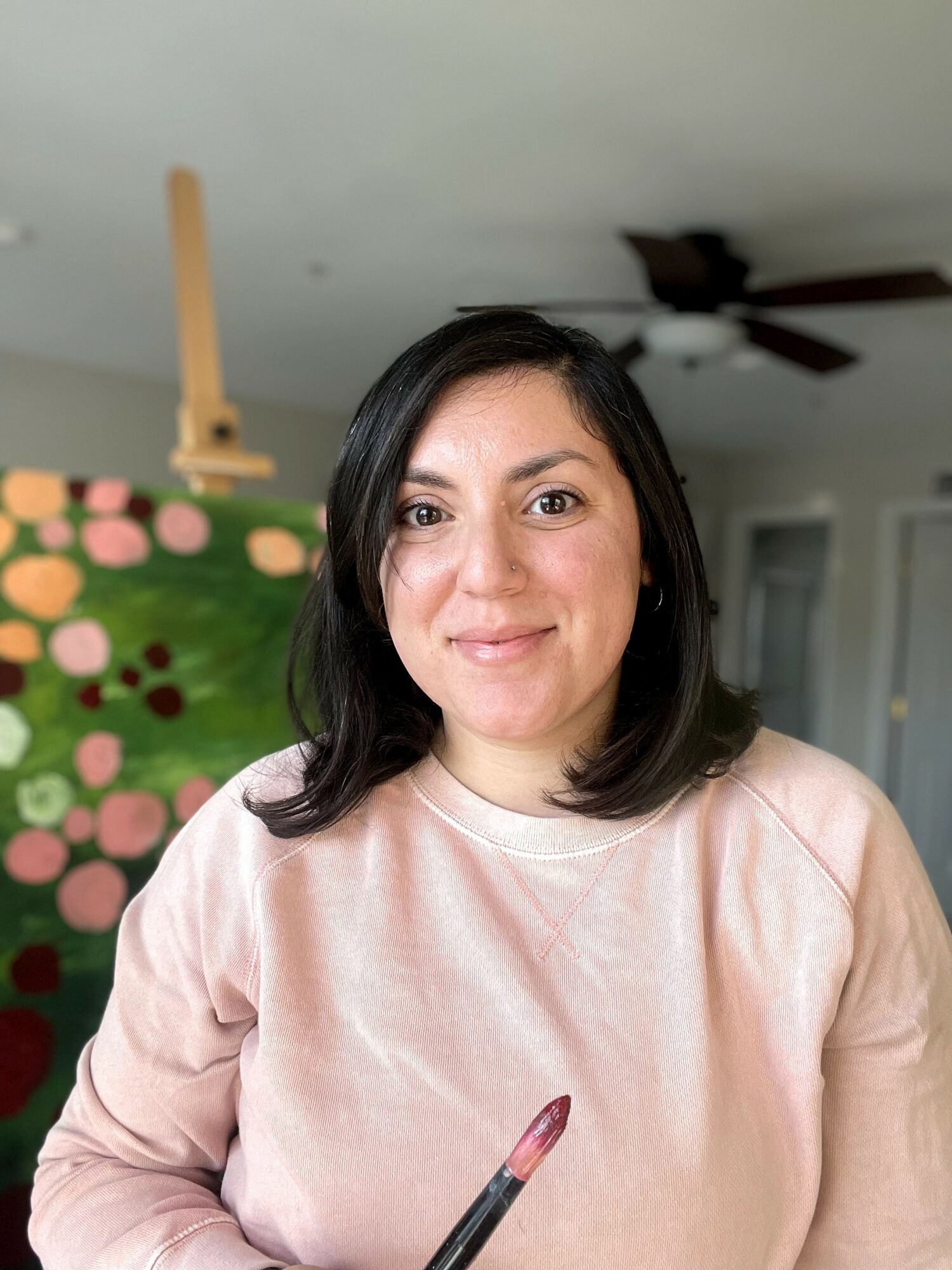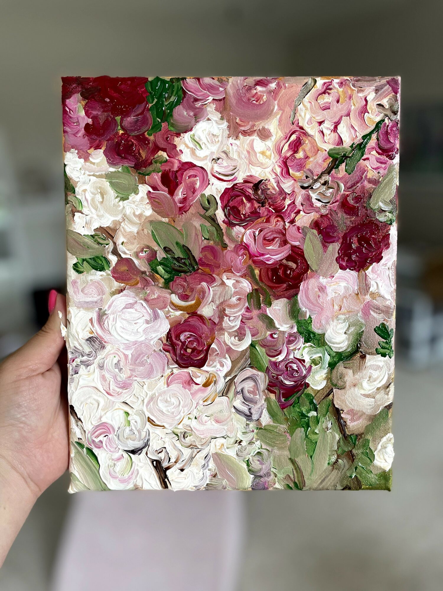 After graduating, I didn’t pursue it as a career but always continued to paint as a hobby. I did a few paintings here and there for friends, painted pieces for my home, etc. After one attempt to sell on Etsy, I found myself lacking in inspiration and didn’t really jive with trying to create for a shop. So I closed up shop and just decided to paint whenever it moved me. And once I had my daughter in 2020, I was tired and in the trenches of postpartum – it was hard to find inspiration to paint, let alone enough time to sit down and create. But one day I did and it really sparked something within me. My style started evolving and I began painting flowers. It felt like such a natural progression: flowers and nature are FULL of texture, expressiveness, and bright colors. Plus, there is a never-ending amount of inspiration out there! I realized at that point that I really wanted to give it a shot to make this a business.