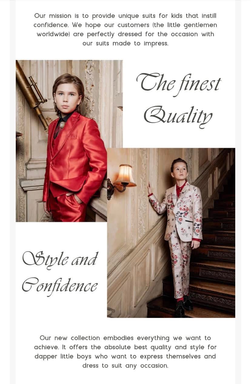 Le Petit Gentleman is a children’s fashion brand that celebrates elegance, confidence, and cultural pride in young boys. We specialize in bold, stylish, and impeccably crafted suits and accessories designed for kids to stand out during life’s most special moments—birthdays, red carpets, graduations, and more. In just a short time, we’ve become the go-to brand for kid models, celebrity children, and families who value both luxury and comfort. To us, every piece is more than clothing; it’s a statement of confidence and individuality, helping boys feel unique and unstoppable.
